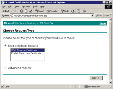 - На странице Choose Request Type (см. Экран 2) задается вопрос о типе запроса. Поскольку нам требуется сертификат для виртуального сервера и у нас имеется сохраненный запрос, следует выбрать Advanced request и щелкнуть Next. Список User certificate request предназначен для сертификации конечных пользователей.