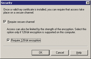 Активизация TLS для входящего трафика не сложнее только что описанной процедуры. Требуется перейти на вкладку Access в окне свойств виртуального сервера и щелкнуть Communication в командной группе Secure Communication. В окне Security, как показано на Экране 6, можно включить поддержку TLS с длиной ключа 40 разрядов (по умолчанию) или указать использование длины ключа 128 разрядов, что я и рекомендую сделать. Нужно иметь в виду, что установка флажка Require secure channel означает буквально следующее: серверы, которые не поддерживают TLS или не могут прочитать настройки TLS вашего сервера, не будут передавать на него почтовые сообщения. Следует быть внимательным, устанавливая Require secure channel; если исходящие сообщения регулярно пропадают, надо задуматься, а стоит ли повышенная секретность потерянных сообщений.