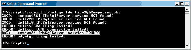 Экран 1. Результаты работы сценария IdentifySQLComputers.vbs