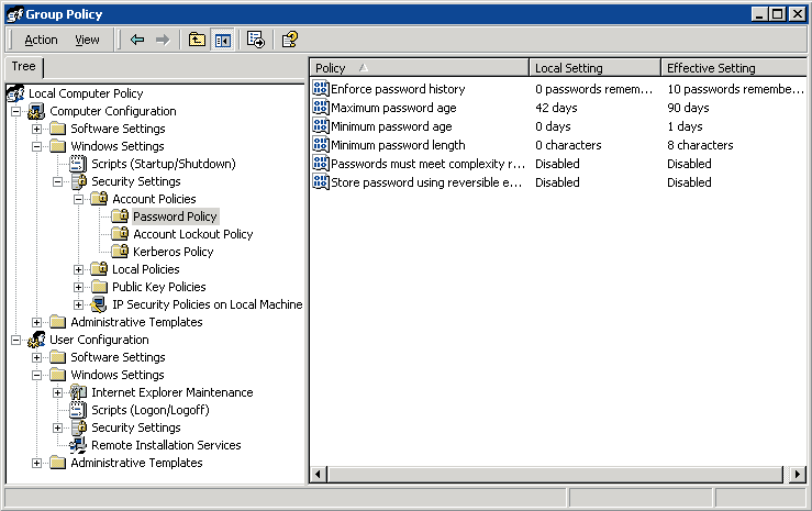 Экран 1. Просмотр политики безопасности локального GPO в Windows 2000