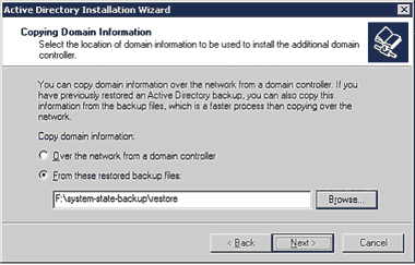 Далее следует запустить программу Dcpromo в режиме advanced mode с помощью команды dcpromo /adv. На экране выбора Domain Controller Type требуется указать переключатель Additional domain controller for an existing domain. На следующем экране (см. экран 4) в разделе Copy domain information нужно выбрать пункт From these restored backup files и указать папку с файлами копии для восстановления (она может располагаться, к примеру, по адресу F:system-state-backup estore).