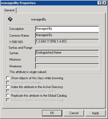 Далее необходимо открыть на компьютере MMC и выбрать в меню Console пункт Add/Remove Snap-in, затем открыть оснастку Schema. Если регистрация выполнялась не на DC, который используется в качестве Schema Master, следует щелкнуть правой кнопкой Active Directory Schema, выбрать Change Domain Controller, ввести имя исполнителя роли Schema Master и щелкнуть OK. Затем в правой панели требуется выбрать нужный атрибут и дважды щелкнуть по нему, чтобы перейти к свойствам. На вкладке General, показанной на экране 1, следует установить или снять флажок Replicate this attribute to the Global Catalog. Эта ячейка будет недоступна, если используемая учетная запись не является членом группы Schema Administrators. По умолчанию в эту группу входит только учетная запись Administrator корневого домена. На всякий случай группу Schema Administrators желательно сохранять пустой и добавлять в нее пользователей, только когда необходимо внести в схему изменения.