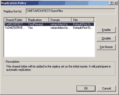 После того как указан общий ресурс для корня Dfs на втором сервере, следует выполнить настройку репликации между обоими ресурсами. По умолчанию Dfs не настраивает репликацию данных автоматически, поэтому ее придется включить. Нужно щелкнуть правой кнопкой по созданному корню Dfs, затем выбрать Replication Policy из контекстного меню, чтобы открыть диалоговое окно Replication Policy, показанное на рис. 5. Следует щелкнуть Enable, чтобы включить репликацию для каждого ресурса, а затем определить, какой ресурс будет главным во время первой репликации. Выберите Set Master для этого ресурса. После выполнения перечисленных шагов Windows 2000 будет реплицировать данные между этими ресурсами и содержать их синхронизированными. Как только произойдет первоначальная репликация, разница между первичным ресурсом и другими ресурсами исчезнет.