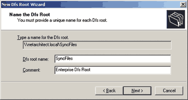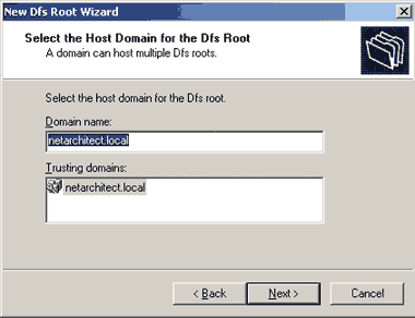 Затем следует решить, в каком домене AD нужно разместить создаваемый корень Dfs. Требуется выбрать домен, который больше подходит для конкретной ситуации, как показано на рис. 3. Доменное имя, выбираемое нами на данном шаге, — это то имя, которое конечные пользователи будут применять для подключения к корневой структуре Dfs. Например, когда пользователи захотят подключиться к корню Dfs в нашем случае, они будут обращаться к etarchitect.localDfs root name, а не подключаться непосредственно к какому-либо серверу.