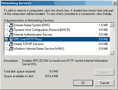 Для реализации RPC over HTTP необходимо выполнить на серверах несколько изменений. Прежде всего нужно убедиться, что на сервере, применяемом в качестве сервера-посредника RPC, установлена служба RPC over HTTP Proxy. Для этого следует открыть утилиту Add/Remove Programs панели управления и щелкнуть на вкладке Add/Remove Windows Components. Затем нужно отметить пункт Networking Services, убедиться, что выбрана служба RPC over HTTP (экран 1) и щелкнуть на кнопке OK, чтобы развернуть службу.