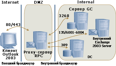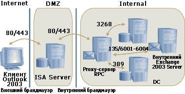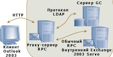 Архитектура RPC over HTTP напоминает модель внешний/внутренний сервер (front end/back end server), впервые примененную Microsoft в Exchange 2000 Server и используемую в OWA, IMAP и POP3. Outlook 2003 связывается через протокол 2003 с proxy-сервером RPC, также известным как внешний proxy-сервер RPC. Proxy-сервер RPC действует от имени клиента, устанавливая RPC-соединения с внутренним сервером, на котором размещается почтовый ящик клиента. Соединения показаны на рисунке 1.