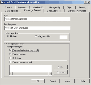 Аутентифицированные группы рассылки (DG). Аутентифицированные группы рассылки, также известные как ограниченные группы рассылки (restricted DG) — новое свойство Windows DG. Благодаря им посылать сообщения в DG могут только аутентифицированные пользователи Windows. В то же время данная функция препятствует авторам спама злоупотреблять DG, используя их для рассылки непрошеных сообщений членам групп. Действие функции основано на новом атрибуте MS-Exch-Authenticated-Only, добавленном к атрибутам AD группы рассылки. Чтобы воспользоваться этой функцией, нужно установить флажок From authenticated users only на вкладке Exchange General в диалоговом окне Properties группы рассылки (экран 3). Доступ к окну можно получить из оснастки Active Directory Users and Computers консоли MMC.