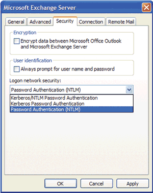 В Exchange 2003 реализована аутентификация на базе Kerberos для клиентов MAPI. Kerberos — испытанный открытый стандарт для надежной аутентификации в распределенной среде клиент/сервер, определенный в документе Request for Comments (RFC) 1510 рабочей группы Internet Engineering Task Force (IETF). Для того чтобы можно было воспользоваться преимуществами аутентификации Kerberos для MAPI, на клиенте должен работать Outlook 2003. Для настройки конфигурации Kerberos следует обратиться к вкладке Security учетной записи Outlook 2003 Exchange и выбрать пункт Kerberos Password Authentication из раскрывающегося меню Logon network security (экран 7).