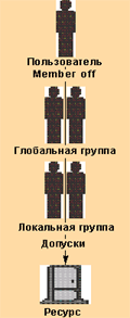 Для экономии времени можно действовать по-другому. Наряду с локальными группами для регулирования доступа к ресурсу создают соответствующие им глобальные группы, включают последние в состав локальных и для предоставления доступа делают пользователей членами соответствующих глобальных групп. При перемещении ресурса все усилия сводятся к раздаче разрешений на доступ к объектам новым локальным группам и включению в них старых глобальных групп, которые остаются без изменений. В результате получается цепочка взаимосвязей: учетная запись — глобальная группа — локальная группа — разрешения на доступ к объектам.