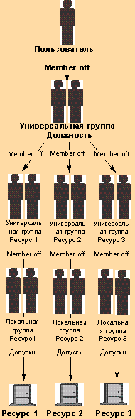 - Для каждого ресурса создаются универсальные группы, регулирующие доступ к объектам. Для каждой локальной группы, соответствующей определенному уровню доступа к объекту, создается соответствующая ей универсальная группа, которая включается в состав данной локальной группы.