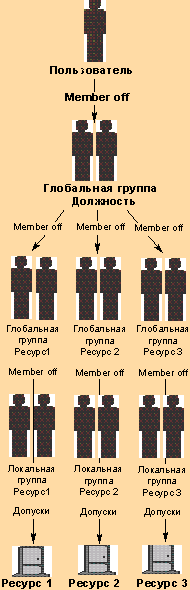 Каждый ресурс, за исключением объектов Active Directory, расположен на каком-либо компьютере. Для регулирования доступа к этому ресурсу создаются локальные группы на данном компьютере либо локальные доменные группы в домене Active Directory. В списках допусков к объектам, составляющим ресурс, фигурируют только эти локальные группы. Число локальных групп соответствует числу уровней доступа, необходимому для данного ресурса. Таких уровней как минимум два: для администрирования ресурса и для повседневного использования.