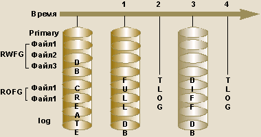 Теперь рассмотрим процесс анализа разрушенной базы с применением режима RESTORE WITH STANDBY. На рис. 2 показан пример такого анализа. База данных состоит из семи файлов: одна основная (primary) файловая группа, три файловые группы read/write (RWFG), две — read-only (ROFG), а также один журнал транзакций. Предположим, что в момент времени time-point 1 была создана полная резервная копия базы данных, Full Backup, в момент времени time-point 2 — резервная копия журнала транзакций, в момент времени time-point 3 — Differential Backup базы данных и в момент времени time-point 4 — очередная резервная копия журнала транзакций. Между каждыми двумя заданиями резервного копирования тот же самый сценарий модифицирует данные в базе, так что всякий раз резервные копии отличаются одна от другой.