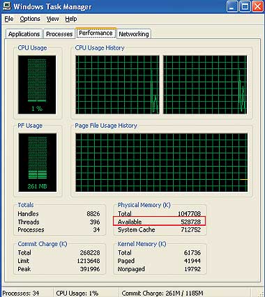| Экран 1. Счетчик доступной памяти в Task Manager |