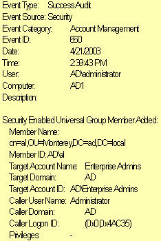 С помощью события создания учетных записей можно очистить AD от избыточных и нестандартных учетных записей пользователей, компьютеров и групп. Удалить избыточные и ненужные объекты гораздо легче вскоре после их создания, чем по прошествии значительного времени, когда никто не помнит, для чего предназначался объект или почему он был создан. Администратор может немедленно проверить события создания и определить соответствие новых учетных записей пользователей, групп и компьютеров политикам и процедурам организации. Появление новой учетной записи компьютера означает, что кто-то добавил в домен рабочую станцию или сервер. Сравнив событие с ID 645 с планом развертывания новых компьютеров, можно проверить, было ли добавление компьютера санкционированным. Событие с ID 624 позволяет отслеживать учетные записи новых пользователей домена, проверять корректность новых учетных записей пользователей и применять любые политики для соглашений об именовании, документирования информации о сотрудниках/подрядчиках, общих учетных записях или учетных записях приложений.