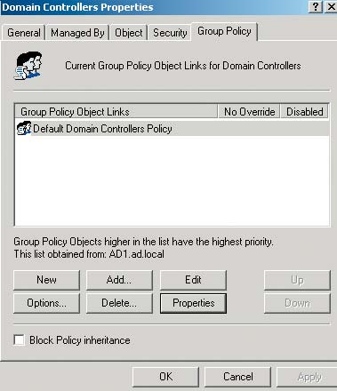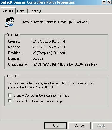 Следует обратить внимание, что Windows 2000 не сообщает описательное имя GPO, как в оснастке Active Directory Users and Computers консоли Microsoft Management Console (MMC). Вместо этого событие сообщает отличительное имя (distinguished name, DN) объекта в формате X.500. Например, на экране 2 Object Name — CN={6AC1786C-016F-11D2-945F-00C04fB984F9}, CN=Policies,CN=System, DC=ad,DC=local. Полезная информация в DN объекта GPO содержится в длинной начальной последовательности символов — это глобально уникальный идентификатор (GUID) GPO. С помощью оснастки Active Directory Users and Computers можно связать описательное имя GPO с его GUID. Например, чтобы получить GUID для Default Domain Controllers Policy GPO, требуется открыть диалоговое окно Properties для Domain Controllers OU и выбрать вкладку Group Policy. В списке GPO нужно выбрать политику Default Domain Controllers Policy и щелкнуть на Properties. GUID объекта GPO отображается на вкладке General в поле Unique name (экран 3).