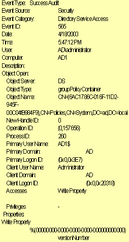 К сожалению, Windows 2000 регистрирует в журнале Security не описательное имя, а GUID атрибутов схемы, и Dumpel не преобразует GUID в имя. Поэтому дамп события с ID 565 выглядит так, как показано на экране 7. Расшифровать его можно с помощью документации схемы Windows 2000 AD, приведенной по адресу http://msdn.microsoft.com/library/default.asp?url=/library/en-us/adschema/adschema/windows_2000_schema.asp. Просмотрев данный сайт, можно убедиться, что bf967aa5-0de6-11d0-a285-00aa003049e2 — схема GUID для organizational-Unit, а f30e3bbe-9ff0-11d1-b603-0000f80367c1 и f30e3bbf-9ff0-11d1-b603-0000f80367c1 — идентификаторы GUID для gPLink и gPOptions. Располагая этой информацией, можно использовать команды