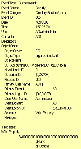 Другая область изменений, связанных с Group Policy и требующих мониторинга, — изменение определяемых групповыми политиками свойств OU. Как показано на экране 4, у каждой OU есть список связанных с ней GPO; каждый GPO из этого списка имеет два параметра — No Override и Disabled. Кроме того, OU располагает наследуемым флажком Block Policy, также связанным с Group Policy. Если кто-то устанавливает или разрывает связь с GPO либо устанавливает или сбрасывает любые другие параметры, эти изменения могут иметь важные последствия для компьютеров и пользователей в данной OU. Чтобы обнаружить изменения в списке связанных GPO, изменения параметров No Override или Disabled либо изменения наследуемого значения Block Policy, необходимо отыскать событие с ID 565 со значением organizationalUnit параметра Object Type и значениями gPOptions и gPLink параметра Write Property (экран 5).