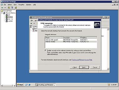По завершении настройки сетевых адаптеров нужно установить службу Routing and Remote Access. Следует открыть оснастку Routing and Remote Access, щелкнуть правой кнопкой мыши на имени сервера, который был выбран для установки Routing and Remote Access, и запустить мастер Routing And Remote Access Server Setup Wizard (для этого нужно выбрать пункт Configure and Enable Routing and Remote Access). Щелкните на элементе Remote access (dial-up or VPN) и далее — на кнопке Next. В окне Remote Access следует установить флажок VPN, сбросить флажок Dial-up и нажать Next. В окне VPN Connection, показанном на экране 2, нужно выбрать соединение с Internet, установить флажок Enable security on the selected interface by setting up static packet filters и нажать Next. В окне IP Address Assignment требуется указать, каким образом сервер VPN будет назначать клиентам VPN IP-адреса внутренней сети. Можно сделать так, чтобы сервер VPN получал произвольный адрес от сервера DHCP, или назначать IP-адрес из тех адресов, которые выделены в сети для клиентов VPN. Проще всего воспользоваться услугами сервера DHCP. Но не исключено, что вы захотите использовать зарезервированный диапазон адресов. Прийти к такому решению заставляют два обстоятельства. Во-первых, в этом случае можно с легкостью идентифицировать весь клиентский трафик VPN во внутренней сети, ибо в вашем распоряжении будут исходные IP-адреса (тогда как при использовании адресов, предоставленных сервером DHCP, адреса клиентов VPN будут идти вперемешку с адресами локальных клиентов). Во-вторых, чтобы обеспечить дополнительную защиту содержащим конфиденциальные данные серверам внутренней сети, которые не обязательно должны быть доступны удаленным пользователям, вошедшим в сеть по каналам VPN, можно будет настроить фильтры этих компьютеров на блокировку пакетов с адресами отправителей, входящими в диапазон адресов клиентов VPN. И тогда, если какой-нибудь хакер сумеет использовать сервер VPN для успешного вторжения во внутреннюю сеть, он не сможет напрямую атаковать серверы с конфиденциальными данными. Сделав соответствующий выбор, нужно щелкнуть Next.