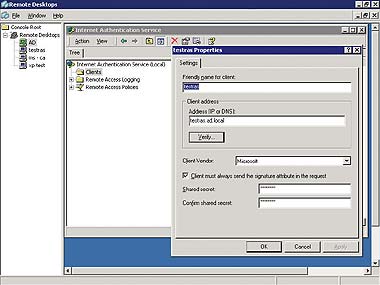 Теперь контроллер домена готов к приему запросов от сервера VPN, но перед тем, как проверять это на практике, нужно откорректировать параметр безопасности, не учтенный мастером IAS. Необходимо открыть оснастку Internet Authentication Service, затем выбрать папку Clients. Следует выполнить двойной щелчок на записи клиента; сервер VPN откроет диалоговое окно сервера Properties, показанное на экране 1. Теперь нужно установить флажок Client must always send the signature attribute in the request. Тем самым мы ставим перед системой Windows задачу обеспечивать максимальный уровень защиты трафика RADIUS при прохождении по внутренней сети. Операционная система будет требовать от клиента аутентификации при передаче каждого запроса и обеспечит серверу RADIUS возможность убедиться в том, что запрос не был изменен в процессе пересылки.