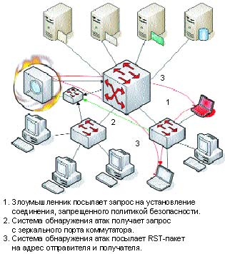 Для того чтобы разорвать любое TCP-соединение, достаточно знать IP-адреса и номера TCP-портов отправителя и получателя, а также текущие значения номеров последовательности (sequence number) сессии TCP. Всей этой информацией NIDS располагает, поскольку прослушивает весь трафик сегмента и вполне может разорвать TCP-соединения, проходящие через контролируемый сегмент (см. рис. 1).