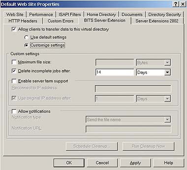 Служба BITS не устанавливается по умолчанию вместе с IIS. Чтобы развернуть BITS на серверах Windows 2003, нужно открыть панель управления и выбрать функцию Add/Remove Programs, Windows Components, Application Server, Internet Information Services (IIS), Background Intelligent Transfer Service Server Extensions. Загрузить версию BITS, которая работает с Windows 2000 Server и IIS 5.0, можно по адресу http://www.microsoft.com/downloads/details.aspx?familyid=17967848-be86-4cd6-891c-ec8241611ad4&displaylang=en.