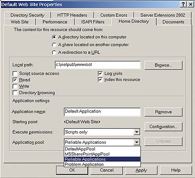 Web-приложения IIS 6.0 работают в исполнительном процессе (worker process) с именем w3wp.exe, который заменяет Dllhost IIS 5.0 (и wam.exe IIS 4.0). Однако в IIS 6.0 можно дать исполнительному процессу имя и управлять им как элементом, называемым «пулом приложений» (application pool). Любому пулу приложений нетрудно сопоставить Web-узел, каталог или виртуальный каталог в диалоговом окне Properties данного элемента (экран 1).