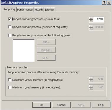 WWW Service Administration and Monitoring автоматически проверяет, реагирует ли пул приложений на запросы, через каждые 30 секунд (по умолчанию) или через интервал, задаваемый на вкладке Health диалогового окна Properties пула приложений. Если пул не отвечает, то WWW Service Administration and Monitoring перезапускает его без вмешательства администратора, что существенно повышает надежность. Кроме того, время цикла (останова и нового запуска) пула можно задать с помощью параметров на вкладке Recycling (экран 2). Например, по умолчанию время цикла пула приложений составляет 1740 минут (29 часов). На мой взгляд, не имеет никакого смысла принимать данное значение в качестве стандартного, поэтому я назначил рециркуляцию на определенное время суток, 3.00 утра по местному времени. Рециркуляция по графику удобна для приложений, требующих периодического перезапуска.