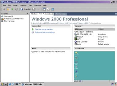 В ходе тестирования производительность виртуальных машин VMware была хорошей по сравнению с физическими системами с той же ОС. Единственное заметное эксплуатационное различие между VM и физической системой состоит в том, что в VM вместо комбинации клавиш Ctrl+Alt+Ins используется комбинация Ctrl+Alt+Del. Я без проблем обращался из VM к накопителю CD-ROM и выяснил, что VM полностью совместимы с такими USB-устройствами, как флэш-память.