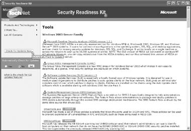 Эти инструменты вошли в компакт-диск SRK, что позволяет быстро устанавливать их на серверах без Internet-соединения. По щелчку на гиперссылке в SRK запускается исполняемый файл, который выполняет установку инструмента. С Web-узла Microsoft Security Tools (http://www.microsoft.com/technet/treeview/ default.asp?url=/technet/security/ tools/default.asp) можно загрузить множество других инструментов.