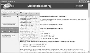 Осенью 2004 г. подписчики службы Microsoft TechNet получили пакет Security Readiness Kit (SRK) 4.1 на компакт-диске. Все остальные пользователи могут загрузить полный пакет из сети по адресу http://www.microsoft.com/technet/security/ readiness/default.mspx. Как и в предыдущих версиях пакета, в SRK 4.1 объединены документация, инструментарий, исправления и пакеты обновлений. Благодаря централизации ресурсов станет проще проверять, развертывать и защищать все версии платформы Windows.