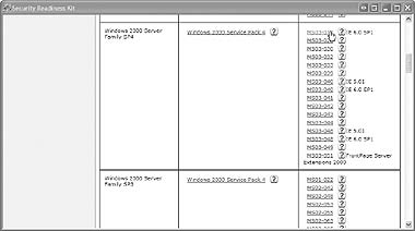 Пакеты обновлений и исправления безопасности. В подразделе Service Packs and Security Updates в удобной для просмотра таблице собраны все исправления для каждого продукта, распределенные по пакетам обновлений. Например, если развернут Windows 2000 Server с пакетом Service Pack 4 (SP4), то можно увидеть исправления с помощью линейки прокрутки (экран 3). Щелчком на подчеркнутой гиперссылке можно загрузить исправления с Web-узла Microsoft, а по щелчку на пиктограмме вопросительного знака (?) будет вызван бюллетень по конкретному исправлению. Такая таблица, в которой исправления распределены по продуктам, еще более эффективна в сочетании с функцией автоматического обновления. Совместно эти компоненты образуют локально управляемый и полный набор ссылок на все исправления и бюллетени безопасности Microsoft, который поможет сэкономить время при поиске конкретного исправления на Web-сайте компании.