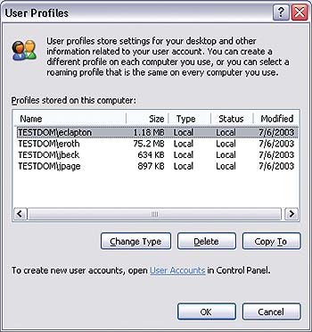 Возможности администратора в отношении применения локального профиля пользователя с целью управления пользовательской средой не так велики, но он может копировать и удалять эти профили. Для выполнения таких действий в XP Pro нужно открыть в Control Panel приложение System, выбрать вкладку Advanced, затем щелкнуть Settings в области User Profiles. Появится список пользовательских профилей, хранящихся на локальной системе, как показано на экране 1. За один раз можно выбрать один профиль для удаления или копирования и помещения в другой каталог.