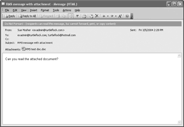 На любой файл Excel 2003, PowerPoint 2003 или Word 2003, присоединяемый к RMS-защищенному сообщению, распространяются все ограничения родительского сообщения. Если нужно защитить документ, не ограничивая доступ к сообщению, то следует определить разрешения доступа к документу, а не к основному сообщению. Этот метод расширяет выбор вариантов защиты. После того как будут определены разрешения и сохранен файл, можно создать новое сообщение Outlook, присоединить файл и послать сообщение как обычно, без ограничений.