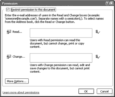- В диалоговом окне Permission (экран 5) нужно установить флажок Restrict permission to this document. Если известно, что все получатели располагают Office Pro 2003, то можно ввести имена или адреса электронной почты получателей в поля Read и Change и щелкнуть на кнопке OK.