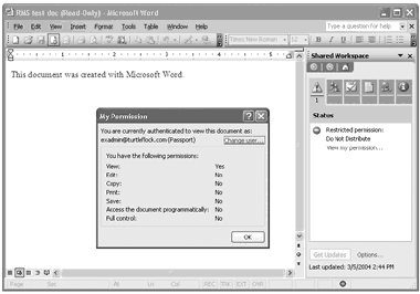 Единственная политика разрешений для почтовых сообщений Outlook — Do Not Forward, которая блокирует пересылку, печать, копирование и распечатку экрана Windows (хотя последнюю операцию можно выполнить с помощью сторонних инструментов захвата экрана). Microsoft Office Excel 2003, Office PowerPoint 2003 и Office Word 2003 располагают более широкими функциями, о которых будет рассказано далее.