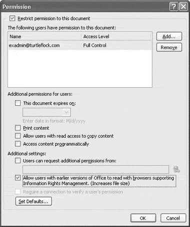 - Если неизвестно, какими программами располагают получатели, можно разрешить чтение документов в IE. Для этого нужно щелкнуть на кнопке More Options, чтобы вывести на экран расширенное диалоговое окно Permission (экран 6). Далее следует установить флажок Allow users with earlier versions of Office to read with browsers supporting Information Rights Management. Как указано в диалоговом окне, в этом режиме увеличивается размер файла, так как Word сохраняет отдельное представление документа в формате HTML, которое можно прочитать в IE. Затем можно щелкнуть на кнопке Set Defaults, чтобы по умолчанию открывать будущие документы в браузере.