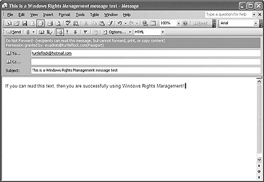 Системные администраторы давно нуждаются в способах защиты сообщений Outlook от копирования, пересылки, вывода на печать и запрета доступа к сообщениям после определенной даты. До недавнего времени такие возможности предоставляли исключительно инструменты и службы независимых поставщиков. В соответствии с инициативой Trustworthy Computing, учитывая требования к конфиденциальности цифровой информации, Microsoft предложила продукт Windows Rights Management Services (RMS) for Windows Server 2003 (http://www.microsoft.com/windowsserver2003/rm) для защиты документов и сообщений. Не следует путать RMS с DRM (Digital Rights Management — управление цифровыми правами), платформой Microsoft для безопасного распространения видео, аудио и других цифровых мультимедиа-файлов, которые пользователи могут воспроизводить только на компьютерах с авторизованным лицензионным ключом. С помощью реализованных в RMS функций управления информационными правами (Information Rights Management — IRM) организации могут ограничить круг лиц, работающих с документом или почтовым сообщением, и определить операции, которые можно производить с документом или сообщением.