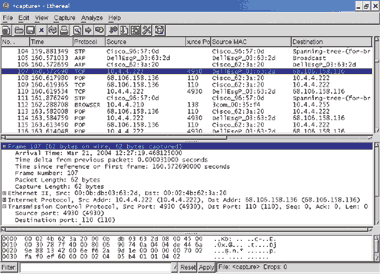 В Ethereal можно найти все функции, которые должны присутствовать в анализаторе протоколов. Можете перехватить или отобразить весь сетевой трафик или только ту его часть, которая удовлетворяет заданному критерию. По умолчанию для отображения трафика необходимо остановить перехват пакетов, хотя можно настроить Ethereal на отображение трафика одновременно с перехватом пакетов (что приведет к снижению производительности). Существует возможность распечатать трассу пакета с различной степенью детализации и в разных форматах или сохранить в файлы, которые будут анализироваться позже. Можно выполнить конвертацию собранной информации, такой как адреса IP и MAC-адреса, в общие имена, и отображать имена, а не набор цифр.