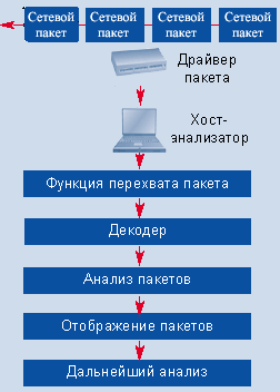 Большинство анализаторов сетевых протоколов работают по схеме, представленной на рис. 1, и отображают, по крайней мере в некотором начальном виде, одинаковую базовую информацию. Анализатор работает на станции хоста. Когда анализатор запускается в беспорядочном режиме (promiscuous mode), драйвер сетевого адаптера, NIC, перехватывает весь проходящий через него трафик. Анализатор протоколов передает перехваченный трафик декодеру пакетов анализатора (packet-decoder engine), который идентифицирует и расщепляет пакеты по соответствующим уровням иерархии. Программное обеспечение протокольного анализатора изучает пакеты и отображает информацию о них на экране хоста в окне анализатора. В зависимости от возможностей конкретного продукта, представленная информация может впоследствии дополнительно анализироваться и отфильтровываться.