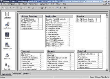 Вид Expert View (см. экран 3) построен в соответствии с моделью Open System Interconnection (OSI). Различные уровни формируют различные события, чтобы облегчить процесс поиска неисправности. Например, модуль экспертного анализа канального уровня может сообщить о попытке подмены MAC-адресов (спуфинге) или «широковещательном шторме», а на транспортном уровне может обнаружиться ошибка четности IP или SYN-атака. Expert View оказывается эффективным почти во всех своих проявлениях, хотя прикладной уровень нуждается в более глубокой проработке. В этой части экспертный модуль учитывает только базовые приложения, такие как FTP, HTTP и NetWare Core Protocol (NCP), но даже для этих немногих протоколов представленных счетчиков недостаточно. Некоторые конкурентные продукты предлагают Exchange, SQL Server и множество других популярных приложений и счетчиков.