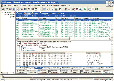 На мой взгляд, дешифрующие возможности Observer и полнота информации, представленной на каждом уровне, делают его одним из лучших продуктов, рассматриваемых в настоящем обзоре. Иногда в Observer возникают проблемы с распознаванием популярных протоколов на нестандартных портах (HTTP, RDP); но можно модифицировать декодеры Observer для организации мониторинга соответствующих портов, как и в случае с другими анализаторами. Я считаю, что расшифровка некоторых протоколов у Observer самая лучшая. Он оказался одним из немногих анализаторов, сумевших во всех случаях распознать и декодировать трафик Kerberos и LDAP. Другие анализаторы смогли обнаружить пакеты UDP через порт 88 и отметили их как пакеты Kerberos, но только Observer заметил разницу между запросами Kerberos и успешно предоставленными учетными данными для доступа. Observer также позволяет повторно воспроизводить до 5 Мбайт перехваченного сетевого трафика.