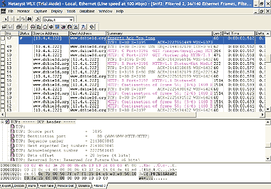 Линия продуктов компании WildPackets включает, в частности, несколько анализаторов протоколов — в зависимости от предъявляемых требований. EtherPeek ориентирован на средний и малый бизнес. Я протестировал версию NX 2.1 (NX означает наличие модуля экспертной оценки). Данный анализатор предлагает свою разновидность типичного трехзонного окна протокольного анализатора — инструментальную панель и журнальное окно в двух нижних зонах (см. экран 7). Интерфейс пользователя в целом приятнее, чем аналогичный компонент в продуктах конкурентов, цветовая дифференциация подобрана лучше. И хотя с технической точки зрения я испытал некоторое разочарование, цветовое решение EtherPeek очень удачное и позволяет легче анализировать протоколы. Большинство анализаторов предлагают возможность цветокодировки пакетов, тогда как EtherPeek выполняет это автоматически и весьма тщательно. Я бы сказал, что среди всех рассмотренных мною продуктов EtherPeek имеет самый лучший пользовательский интерфейс с точки зрения формы и естественной последовательности выполняемых действий.