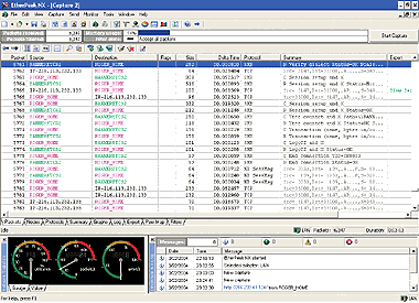 Netasyst Network Analyzer имеет полный комплект всех необходимых функций, включая большое число статистических экранов, диаграмм, ловушек SNMP и триггеров. Продукт поддерживает десятки счетчиков с предустановленными пороговыми значениями, которые можно использовать для генерации предупреждений в различных ситуациях: при медленной работе серверов, высоком уровне трафика VoIP, резком росте числа неудачных попыток регистрации, попытках регистрации через FTP, ошибках дублирования имен WINS, слишком большом проценте ретрансмиссий, при выключении контроллеров домена DC, ошибках второго уровня OSI, широковещательных штормах и изменении сетевой топологии. Хотя счетчики поддерживают большинство анализаторов протоколов, особенность Netasyst Network Analyzer состоит в том, что соответствующие пороговые значения заранее установлены. В беспроводной версии этого продукта можно активизировать функцию обнаружения маршрутизации AP или обнаружения беспроводных узлов. Netasyst Network Analyzer предоставляет большее количество различных функций при работе с VoIP, чем конкурирующие продукты. К сожалению, Netasyst Network Analyzer не умеет декодировать 802.11g, Kerberos или RDP, а поддержка локальных и беспроводных сетей разнесена по различным версиям продукта.
