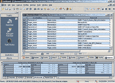 Для каждой трассы перехвата пакетов EtherPeek предоставляет много окон данных. Можно отобразить свыше 90 окон, итоговых сводок, статистических отчетов и видов под разными углами зрения. Большинство изменений выполняется простым щелчком мыши. Уникальная особенность EtherPeek, которую хорошо бы перенять и другим производителям подобных продуктов, — возможность быстро отфильтровать трафик, не требующий вывода на экран. Я нахожу эту возможность полезной в любой ситуации, особенно когда нужно быстро отфильтровать трафик удаленного мониторинга и сконцентрироваться на проблемах реального трафика.