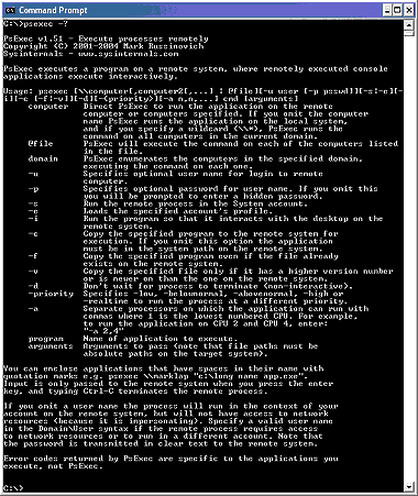Если не указан путь к программе, которую надлежит выполнить, то PsExec обращается в каталог windowssystem32 на удаленной системе. Если известно, что программа находится не в этом каталоге, следует ввести полный путь на удаленной машине; если это выполняемый файл на удаленном компьютере, то нужно указать ключ -c и локальный путь файла. PsExec с ключом -c копирует указанный программный файл на удаленную машину перед выполнением и убирает файл с удаленной системы после завершения работы.