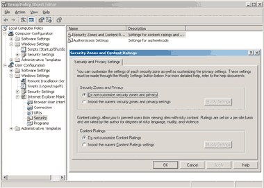 Если в данном объекте групповой политики этот параметр задан не был, настройки копируются с того компьютера, на котором запущен редактор групповой политики. После этого можно их изменить: при нажатии кнопки Modify отображается то же самое диалоговое окно настроек. В групповой политике можно указывать и параметры отображения, и списки сайтов (как тех, которым оказано особое доверие, входящих в зоны Trusted Sites и Local Intranet, так и тех, которым выражено явное недоверие, — зона Restricted Sites). Какие настройки для каких зон устанавливать и какие сайты в какие зоны включать, решается в зависимости от ситуации. Что касается настроек отображения, то здесь разумными представляются те соображения, которыми, по-видимому, руководствовались разработчики Windows Server 2003 Internet Explorer Enhanced Security.