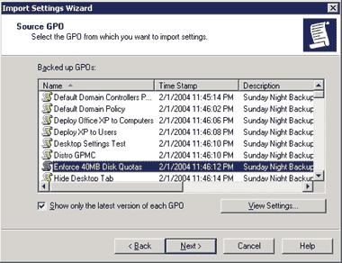 Выбрав местоположение резервной копии GPO из раскрывающегося списка Backup location, необходимо щелкнуть на кнопке Browse. Если в одном каталоге хранится несколько копий одного или нескольких GPO, достаточно просто установить флажок Show only the latest version of each GPO, чтобы увидеть последний набор копий. В противном случае будут показаны все GPO, записанные в каталоге, вместе с информацией о времени создания резервных копий. Чтобы получить напоминание о параметрах, сохраненных внутри GPO, достаточно щелкнуть сначала на GPO, а затем на кнопке View Settings. Наконец, когда все подготовительные операции будут выполнены, следует выбрать GPO и щелкнуть на кнопке Restore. Если нужно удалить объекты из какого-то резервного набора, сделать это можно, щелкнув на кнопке Delete.