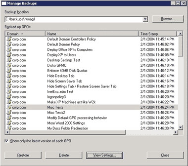Если GPO удален, испорчен или выведен из строя по другой причине и требуется восстановить объект с помощью резервной копии, сделать это можно в любое время, щелкнув правой кнопкой мыши на узле Group Policy Objects и выбрав пункт Manage Backups. В диалоговом окне Manage Backups (экран 2) следует выбрать объекты, которые предстоит восстановить.