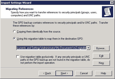 После того как будут введены новые имена назначения, следует воспользоваться функцией Validate in the Migration Table Editor меню Tools, чтобы проверить корректность этих имен. После проверки нужно выбрать пункт Save as из меню File, чтобы сохранить только что созданную таблицу миграции, а затем закрыть ее. На экране вновь появляется окно Migrating References. Теперь вновь следует установить флажок Using this migration table to map them in the destination GPO и выбрать таблицу миграции из раскрывающегося списка. Обычно выбирают самую последнюю таблицу миграции, хотя можно выбрать и одну из ранее созданных таблиц. Пользоваться существующими таблицами миграции удобно, когда приходится повторять одинаковые действия — например, при переносе GPO из одного домена в несколько других. Я также рекомендую установить флажок Use migration table exclusively..., чтобы перенос GPO всегда проходил с корректными ссылками в месте назначения.