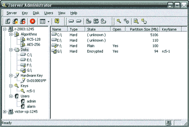 Клиентская часть управляет предоставлением доступа к дискам, операциями с ключами и пользователями системы Zserver (см. экран 1). К операциям с ключами относятся такие действия, как генерация ключей, запись их на смарт-карту или файл, дублирование, загрузка ключей на сервер. Как уже говорилось, через клиентскую часть можно записывать на смарт-карту до 16 различных ключей и загружать их на различные серверы в соответствии с установленной схемой защиты данных. Ключи загружаются в оперативную память сервера и ни при каких обстоятельствах не сбрасываются во временные файлы, размещаемые на носителях данных. Только при загруженном ключе может осуществляться доступ к зашифрованным дискам, выполняться шифрование и дешифрация данных.
